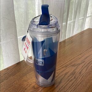 Stylish DD tumbler with a handle and straw. Features a blue and clear design. NEW