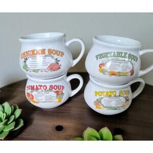 DDJ Recipe Soup Mugs VTG (Ceramic Set of 4) - Tomato, Vegetable, Chicken, Potato