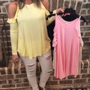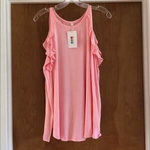 Beautiful pink cold shoulder top with ruffle detailing. Could absolutely fit a medium. Too large for me.Feel free to ask me any questions or make me an offer!