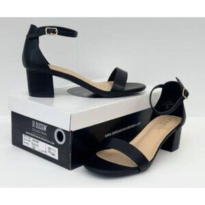 These black sandals feature a classic design with an adjustable ankle strap and a comfortable block heel, providing style and support for all-day wear.