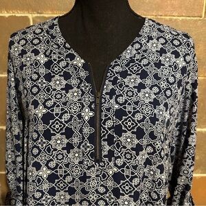 DE Collection Navy White Geo Print Popover Top Women’s S Small