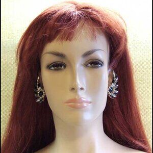 This 1950s high fashion feather design is made of long slender navettes in faceted black glass and clear Austrian crystals. The design also incorporates 3 Rivoli cuts and a comma shaped loop of clear rhinestone chatons. The earrings are clips and this large design measures 2" long x 1 1/4" wide.