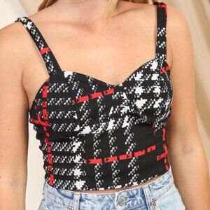 Make a statement this season with our Plaid Techno Crepe Bustier Top. Crafted from structured techno crepe fabric, this fitted crop top offers a flattering silhouette that hugs in all the right places. The bold black, white, and red plaid print adds a festive, modern edge-perfect for holiday gatherings or a night out. Featuring adjustable straps and a sleek cropped cut, it pairs effortlessly with high-waisted trousers, leather skirts, or layered under a blazer for an elevated look.