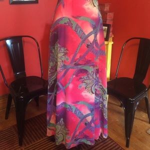 THIS IS A SIZE 9/10 PATTERNED PROM GOWN. BEADED BODICE WITH PINK SASH AT WAIST. BACK ZIP CLOSURE AND FULLY LINED WITH CRINOLINE AT BOTTOM. NEVER WORN.
