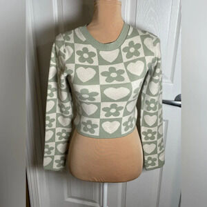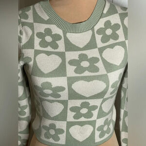 This Debut cropped sweater features a charming pattern of flowers and hearts in a checkerboard design. The green and white color scheme gives it a fresh and stylish look.