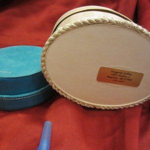 DECORATIVE BOXES, ONE BLUE FAUX LEATHER, ONE CREAM CLOTH & RIBBONS