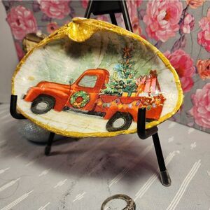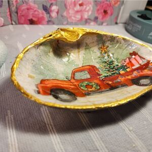 DECOUPAGE CLAM SHELL DECOUPAGE CHRISTMAS RED TRUCK 🚚 ON A CLAM SHELL TRINKET DISH