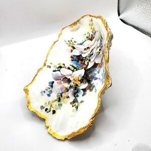 All my decoupage shells are made by me. This shell is called an oyster shell. Every shell has its characteristics. These oyster shells were homes to a living creature once. Possibly have bumps and grooves from growth.