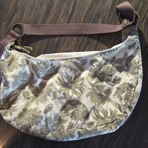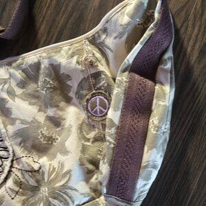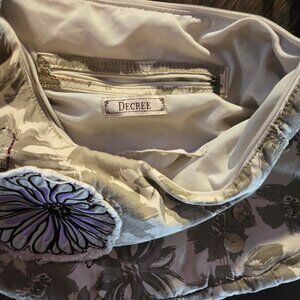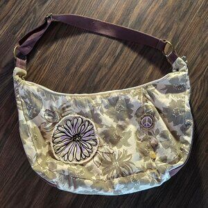 Super awesome large, 100% cotton bohemian/hippie chic style hobo bag from DECREE. Gently loved and in excellent condition. Floral patter with patches of peace sign, large flower and buttons. Zipper top closure. Woven cotton adjustable strap. large/spacious interior with one zipper pocket and one large open pocket. DIMENSIONS: 22" wide x 13" tall x 16" strap drop.