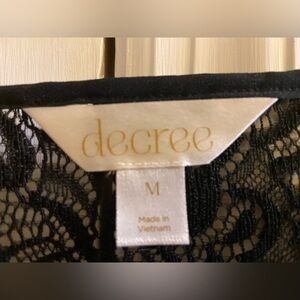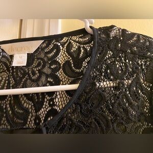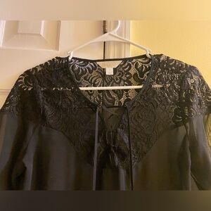 This stunning top has so many many details. Statement sleeves, beautiful lace at top, and is transparent. Ties in front at top middle. Can be sexy or dressy.