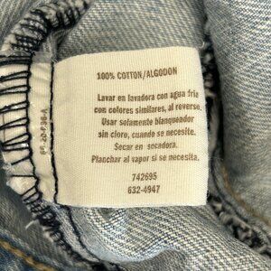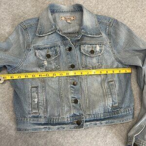 * Juniors size large, cropped-length denim jacket in Y2K style.