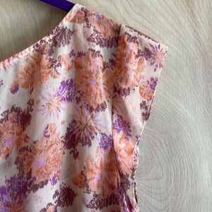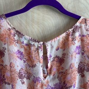 A chic floral blouse with ruffle layers. Features a blend of peach, orange and purple hues.