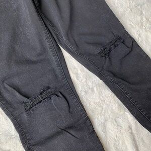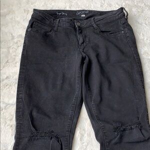Excellent used condition. Hardly worn. Black distressed skinny jeans. Super stretchy. They are 11 in juniors but fits size misses 8-10. Two ribbed holes on knees. Button and zipper closure.