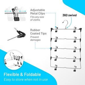 * 🔥 SPACE SAVING PANTS HANGERS- 5 tier trousers hangers, each hanger can hold multiple pants on the hanger, trousers or other clothing. Maximize to save your closet space and keep it clean and orderly. Strong bearing strength and won't be easy to be out of shape. The hanger has a 360° swivel hook that allows you to turn your clothes without moving the hanger, making hanging clothes a breeze.