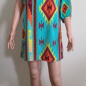 Oh Em Geeee!!! This dress is sostinkin' cute, we don't even knowhow to handle it! In a world of tribalprints, this one is a true stand outwith it's large scale and bold colors.The single sleeve, as well as thefabric works for multiple seasons.Dress is fully-lined. Simply toss it onand go!