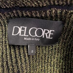 DEL CORE cocktail dress in a black and metallic green merino wool blend knit featuring an all over ribbed pattern, long sleeves, and body sculpting details. Made in Italy.Excellent Pre-Owned Condition.Marked: SMeasurements:Shoulder: 13 in.Bust: 26 - 36 in.Waist: 20 - 26 in.Hip: 23 - 36 in.Sleeve: 26.5 in.Length: 50.5 in.