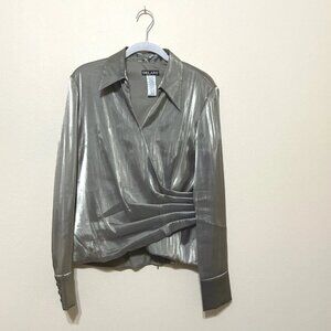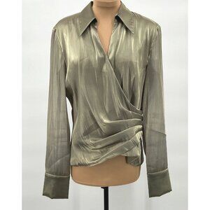 DELARU Olive Green Metallic Long Sleeve Wrap Blouse