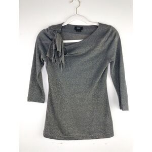 DELETTA Anthropologie Gray Metallic Shirt S Keyhole Bow 3/4 Sleeve Stretch Size