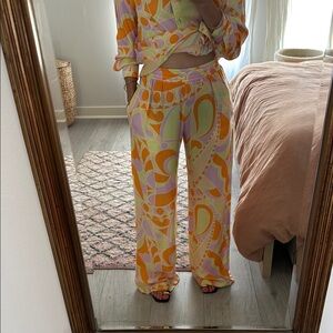 Vibrant set with abstract patterns in orange, yellow, and pink. Perfect for a stylish and comfortable look.