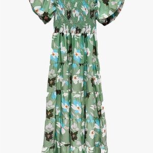 DELI S Puffy Short Sleeve Square Neck Smocked Tiered Ruffle Midi Dress SIZE 8