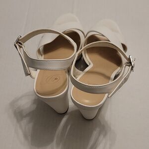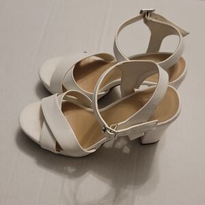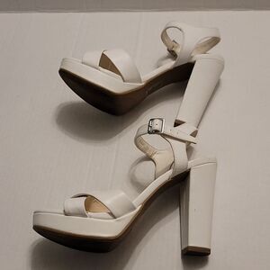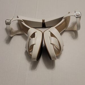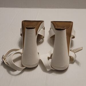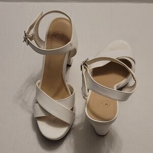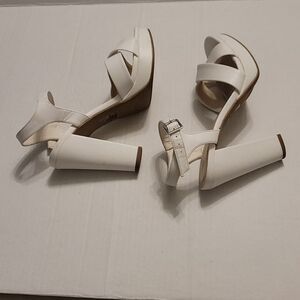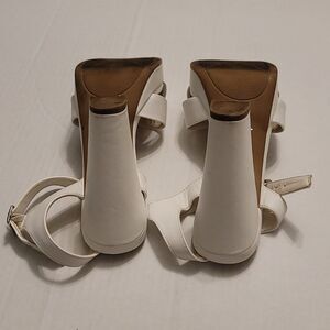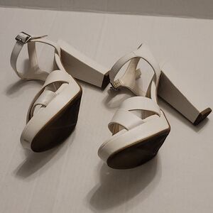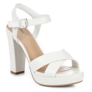 DELICIOUS CRISS-CROS BLOCK HEEL PLATFORM OPEN TOE PLATFORM ESPADRILLE SANDAL SIZE 7 COLOR WHITE Synthetic nubuck upper with synthetic leather lining Adjustable ankle strap with buckle closure all man-made materials Heel height measurements approximately 4 1/2 inch heel height Approx. 1 inch platform height Open round toe S mooth synthetic leather insoleWrapped midsole and durable rubber outsole THIS ITEM IS PRE-OWNED EXCELLENT CONDITION WITH ONLY LIGHT SIGNS OF WEAR IF ANY CHECK THE PICTURES