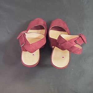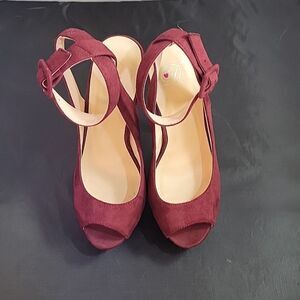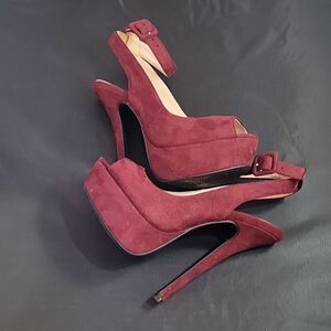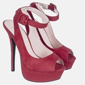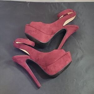 DELICIOUS PEEP TOE ANKLE STRAP HIGH HEEL STILETTOS PUMP SIZE 5M COLOR BURGUNDY DARE TO BE BOLD WITH THESE SUEDE RED HIGH HEEL PLATFORM SHOES! YOU WILL DEFINITELY TURN HEADS AS YOU WALK ACROSS THE ROOM. PAIR THESE WITH A BLACK COCKTAIL DRESS AND RED ACCESSORIES TO MAKE THE SHOES POP! HEEL HEIGHT: 5.5 IN. PLATFORM: 1.5 IN. SUEDE UPPER PEEP TOE BUCKLE CLOSURE AROUND ANKLE SLINGBACK HEEL THIS ITEMS IS PRE-OWNED EXCELLENT CONDITION WITH ONLY LIGHT SIGNS OF WEAR IF ANY CHECK THE PICTURES(FYI THE FIRST PICTURES IS JUST A MODEL TO SHOW HOW THE SHOE LOOK ON CHECK THE PICTURES)