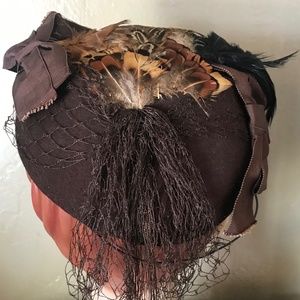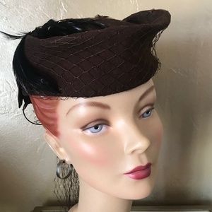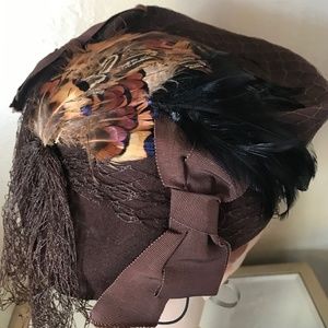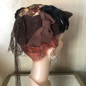 This is a beautiful look from the 1940s'. The hat consists of a brimless shape folded to project upwards & forward, and is elongated towards the back. At each side there are matching brown grosgrain bows. The back of the crown is adorned with beautiful fall colored feathers. The hat is covered with a matching brown veil that is attached to the inside, so it does not cover the face. The veil is tied at the back, cascading down.