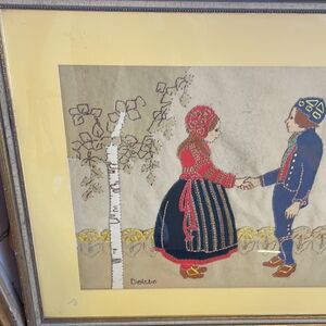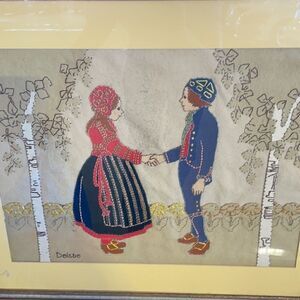 DELSBO antique fabric knitted fiber artwork with glass front and wooden frame. It’s an old distressed piece but very unique and cool. With metal hanging wire on back. 2feet by 2.5 ft