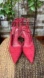 Good condition dress heels by DELTAN. Wrap around with a asymmetric upper design. Juliana suede upper in a rich burgundy color. Back heel is covered in a reptilian design of red and black. Measures approximately 4” in height. Leather interior and exterior sole. One small flaw on front of left shoe (Please examine photos carefully.).
