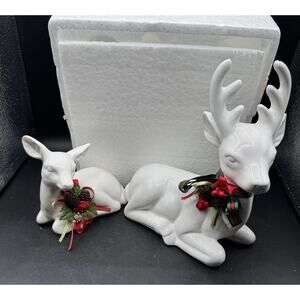 DELUXE DEER FAMILY W/CHRISTMAS BOWS TWO PIECE EARTHENWARE CENTER PIECE