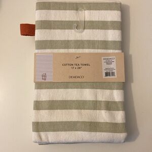 Dish towel features sentiment "Why limit happy to one hour" with accenting stripe pattern