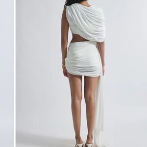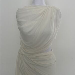 DEME BY GABRIELLE ADELINA - WHITE - NWT DRESS SIZE XS the color is like ofwhite asymmetric draped short dress in net with a dreamy drape falling from shoulders to waist, combined with a softly draped skirt and sophisticated draping detail falling gracefully, Features asymmetrical draping, a chic cutout waist, and high slit with flowing fabric detail. Elegant yet modern, perfect for special occasions, vacations, or a statement night out.💕