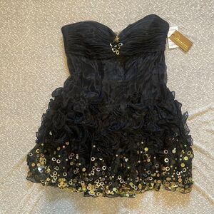 DEMETRIOS Bridal Black Strapless with Gold Sequins Mini Formal Prom Dress 16 NWT