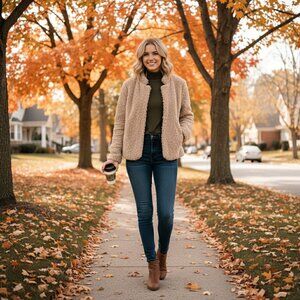 Love the look of faux fur but hate that it makes you look like a big bear? Not with this jacket; it gives you the look of fur without the heft. The jacket has front pockets and fully lined in the matching color of the jacket front. It has a stand up collar, front pockets and open front. Neutral color will compliment anything you wear with it.