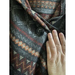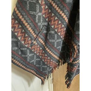 This is a stylish Democracy vest in size L, featuring a gray boho western pattern with a one-button closure. The vest has a cozy feel with fleece fabric and fringe accents, as well as a hood for added warmth. It is designed with a wrap style and includes pockets, making it a versatile piece for various occasions like travel, parties, work, or casual wear. Perfect for the winter, fall, and spring seasons, this vest adds a trendy touch to any outfit with its unique Aztec-inspired pattern.