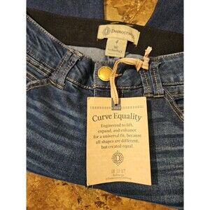 These Democracy Bermuda shorts in size 4 feature a mid-rise waist with a zip closure and button accents. Made from a denim fabric with added stretch, they have a 12.5-inch inseam and a skinny leg style. The classic blue color and solid pattern make them versatile for all seasons. Easy to care for with machine washable instructions, these shorts offer both comfort and style for the modern woman.