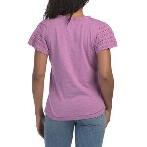 DEMOCRACY Purple Crochet Flutter Sleeve Scoop Neck Knit Top