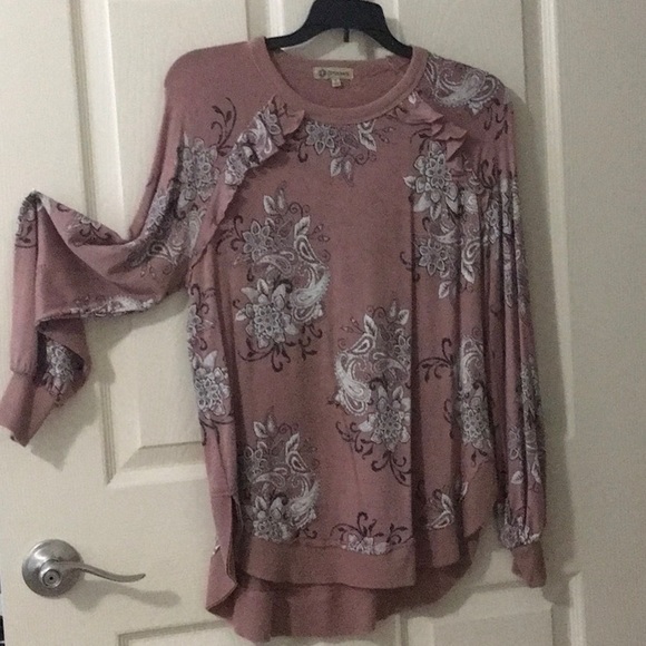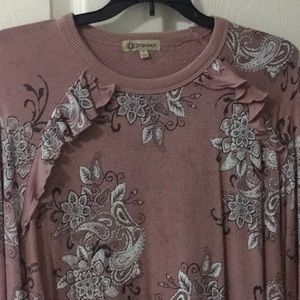 Soft and smooth ruffled sweater with ribbed cuffs. Muted mauve color with soft designs.