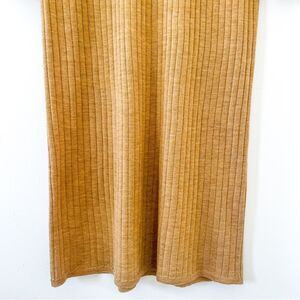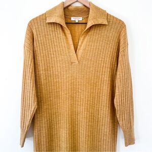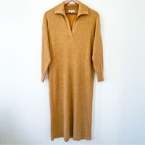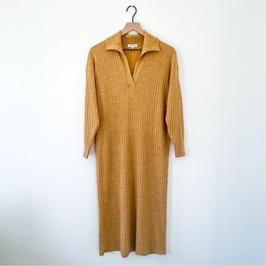 This listing is for a long sleeve midi dress from DEMYLEE New York. It is a classy and stylish dress with an elongated sweater design and gently draped silhouette. This dress is finished throughout with a relaxed, wide ribbed knit and has a buttonless polo collar. It also has ribbing at the cuffs and hem. This dress is a beautiful golden yellow color that pairs well with both neutrals and other vibrant hues. Made of 100% wool, it is warm, comfortable, and beautifully constructed. With minimal signs of wear, this dress is in excellent, gently used condition. It is a size extra small and the measurements (laying flat) are: