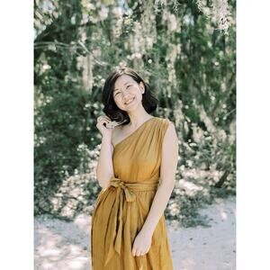 DÔEN One Shoulder Midi Dress M Ochre Ramie Belted Boho Cottagecore Vacation