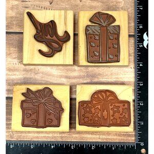 DENAMI DESIGN WOOD MOUNTED RUBBER STAMP SET OF 4 HOLIDAY GIFT BOX JOY
