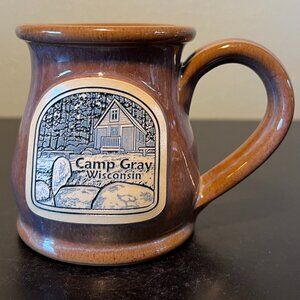 Handcrafted brown glossy glazed pottery mug with subtle purple undertones with a raised blue and tan medallion featuring an incised, intricate image of a wooden building in the woods and text that reads, Camp Gray, Wisconsin. Attractive ribbed interior. Comfortable and easy-to-grip ribbed handle. Deneen Pottery clay is lead and heavy metal free. Dishwasher, microwave, and food safe. Measures 3.75” tall with a 3” diameter; 4.75” across including handle. Holds 11 fluid oz. Unglazed underside features a incised maker's mark and reads, DENEEN POTTERY; HAND THROWN; USA; 2019