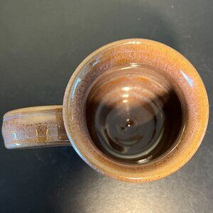 Handcrafted brown glossy glazed pottery mug with subtle purple undertones with a raised blue and tan medallion featuring an incised, intricate image of a wooden building in the woods and text that reads, Camp Gray, Wisconsin. Attractive ribbed interior. Comfortable and easy-to-grip ribbed handle. Deneen Pottery clay is lead and heavy metal free. Dishwasher, microwave, and food safe. Measures 3.75” tall with a 3” diameter; 4.75” across including handle. Holds 11 fluid oz. Unglazed underside features a incised maker's mark and reads, DENEEN POTTERY; HAND THROWN; USA; 2019