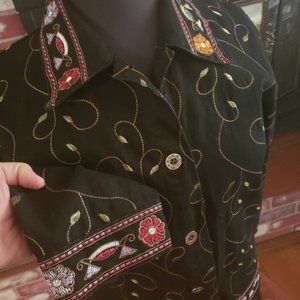 Swoon! LOVE!! LOVE! LOVE! 100% cotton black denim fully embroidered button front jacket. The back is STUNNING! Collar and sleeves are fully Embroidered. The body of the jacket has scrolls with leaves Embroidered. Oversized, Gorgeous! Excellent used condition