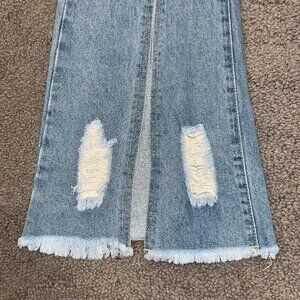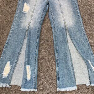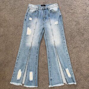 DENIM COLAB High Rise Distressed Wide Split Leg Raw Hem Light Wash Blue Jeans L