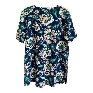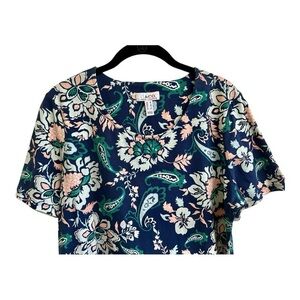 DENIM & COMPANY, WOMENS PULLOVER TOP. NAVY BLUE PAISLEY, SHORT SLEEVE. SIZE M