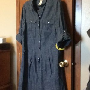 3/4 length adjustable sleeve, button front denim dress. Cotton, polyester, spandex. Pleated waist. Belt loops but missing belt. Nice lightweight. Smoke free pet free
