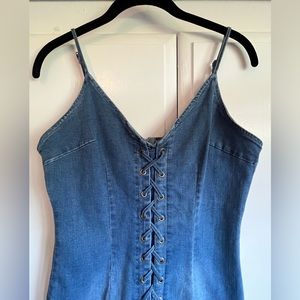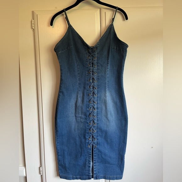 Lace-up in this trendy denim dress to make a stylish statement! This dress features a sleeveless, adjustable spaghetti straps, a trendy lace-up front detail, and a curve hugging, midi silhouette. Denim fabric, moderate stretch.