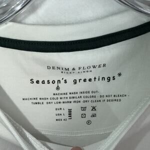 DENIM & FLOWER, Ricky Singh, Size large, White Tee w/Red Merry Christmas on Front and VINTAGE-look Christmas “Toast” MCM Graphic on Back.