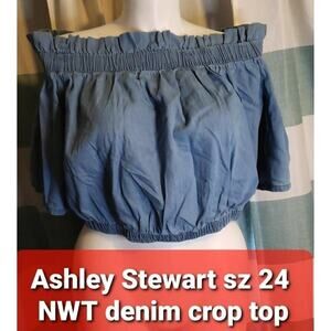 Peasant blouse. Pullover style. Cropped length. Wide sleeves. Elastic stretch fabrication on off-the-shoulder neckline and on bottom hem. Soft and smooth to the touch denim fabrication all over.